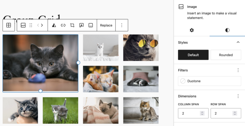 通过更改块检查器中“样式”>“尺寸”下的“列跨度”和“行跨度”设置,可以将网格子项的大小调整为特定数量的行/列。