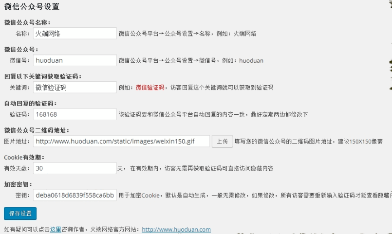 注:你需要在这个插件的设置界面设置关键词和回复的验证码,并且需要在微信公众平台(也可以是第三方托管平台)设置一样的自动回复内容。