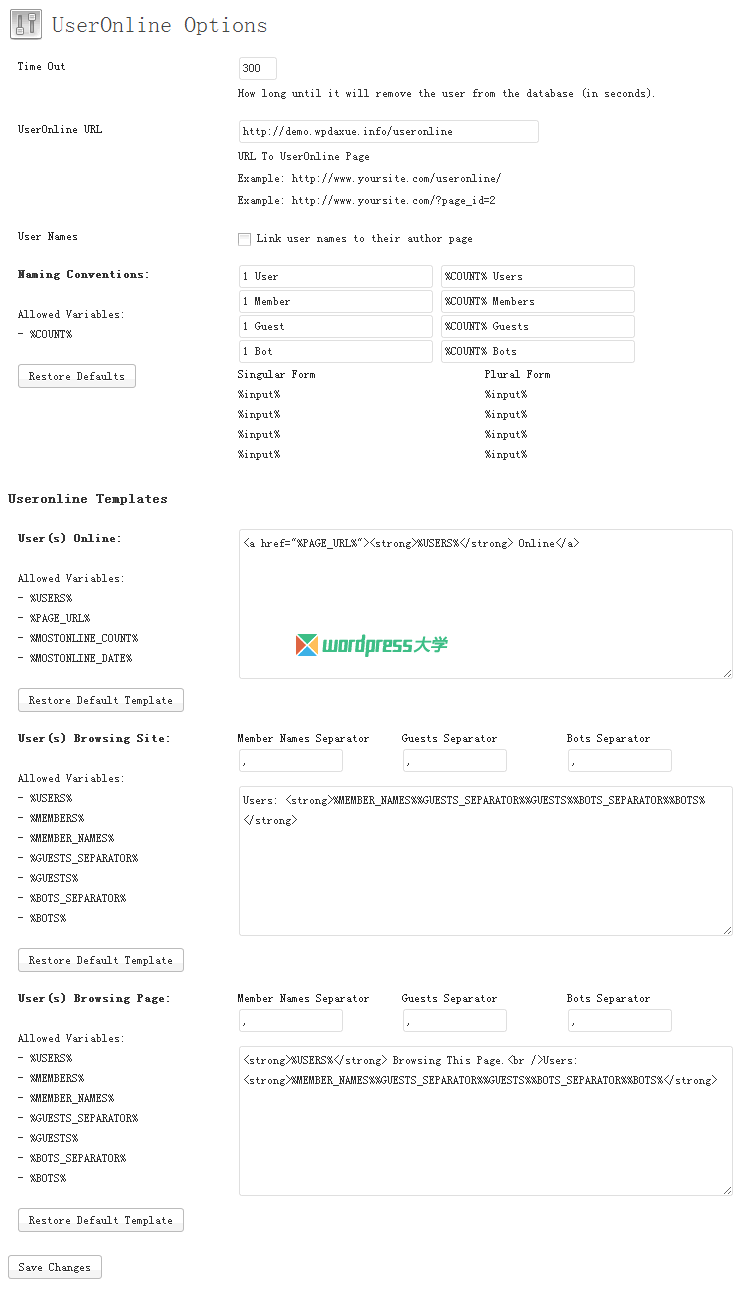 WP-UserOnline 用来统计和显示WordPress当前在线用户/访客/机器人,对于多用户站点有为有用。支持多种方式调用,比如小工具、页面等,还可以使用使用php模板标签进行调用。